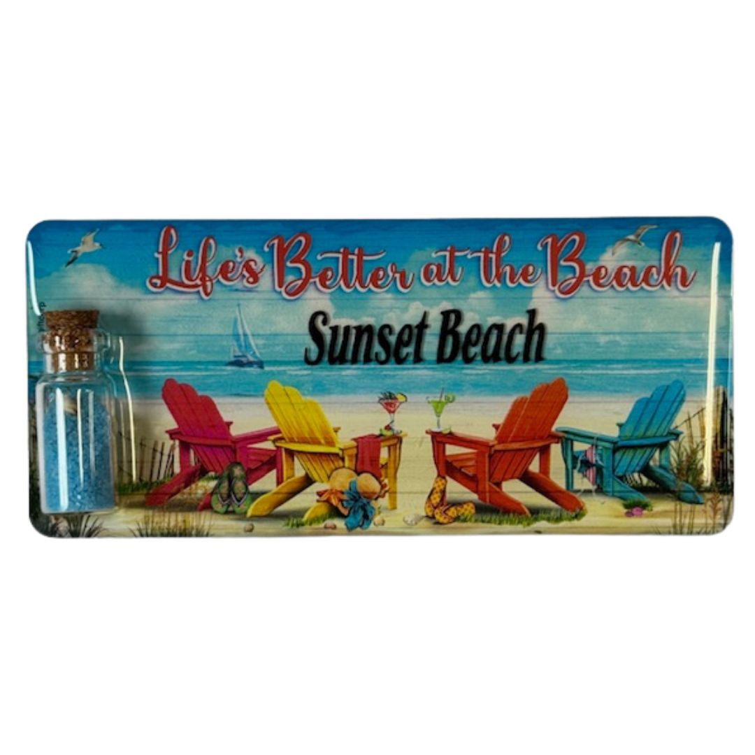 Chairs on the beach and a cute little bottle with blue sand and a shell!